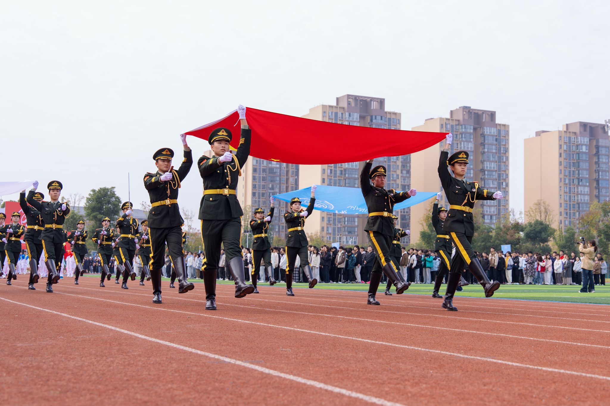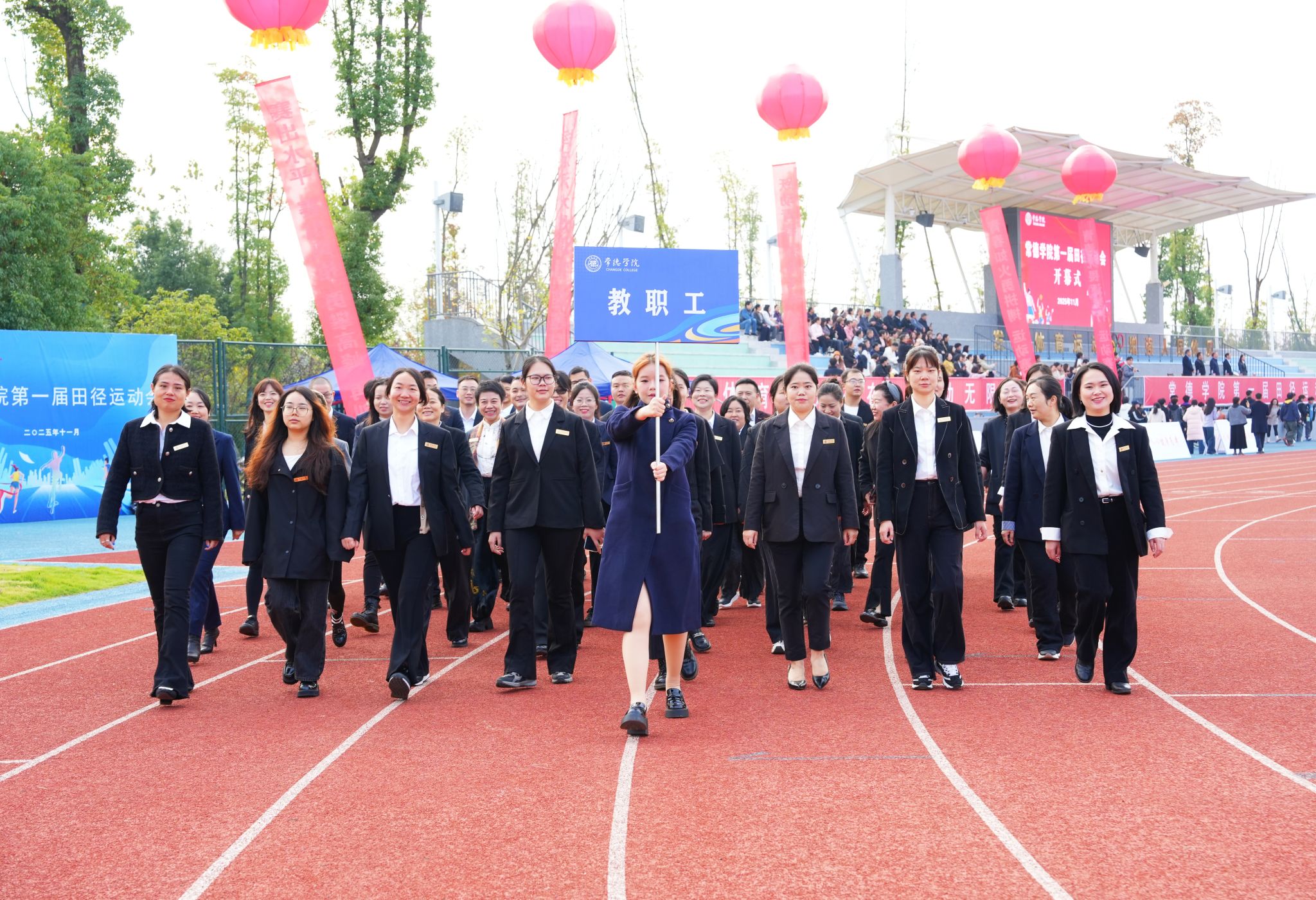 伴随着激昂的旋律和热烈的掌声,国旗护卫队、彩旗方阵、鲜花方阵、裁判员方阵、教职工方阵、各二级学院方阵依次迈着铿锵有力的步伐入场。大家目光坚定、口号激昂,展现出常德学院师生昂扬奋进的精神面貌。
