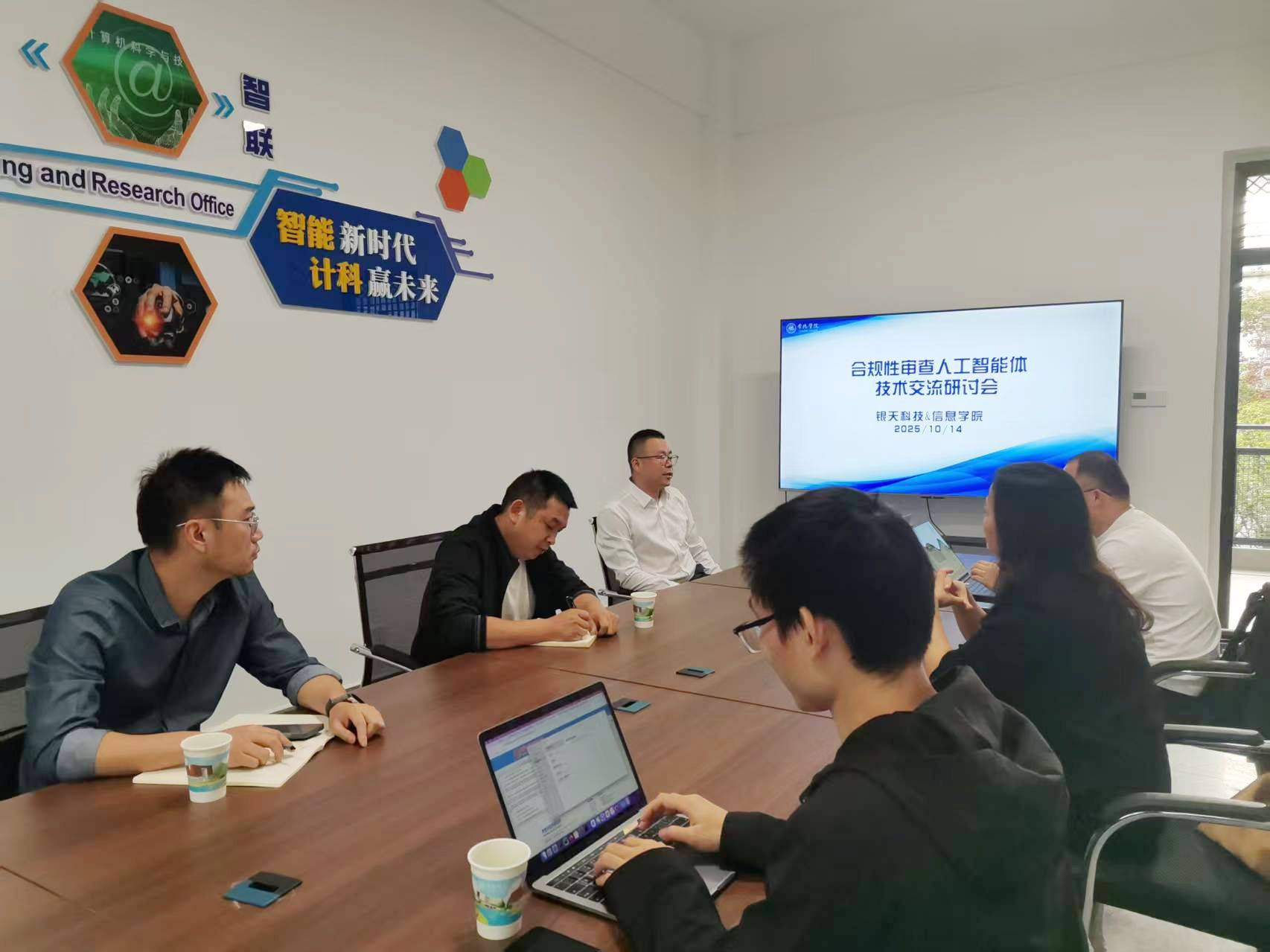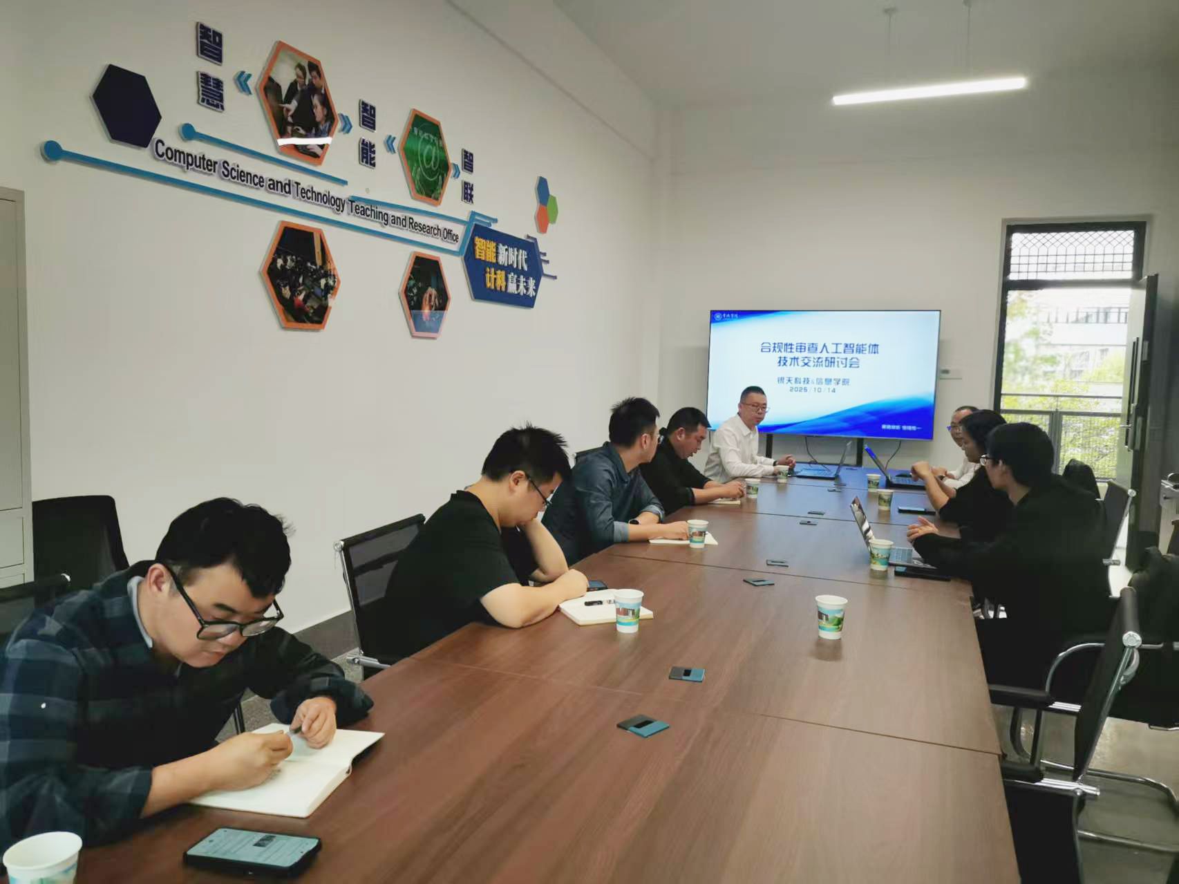 2025年10月15日,信息学院与银天智能科技有限公司在精慧楼213会议室成功举办“合规性审查人工智能体技术交流研讨会”。会议由信息学院卓志宏院长主持,学院文超群博士、易鑫博士、付玺博士、周南副教授,以及银天科技技术总监黎海兵、经理张霞、算法工程师杨淼等共同参与。