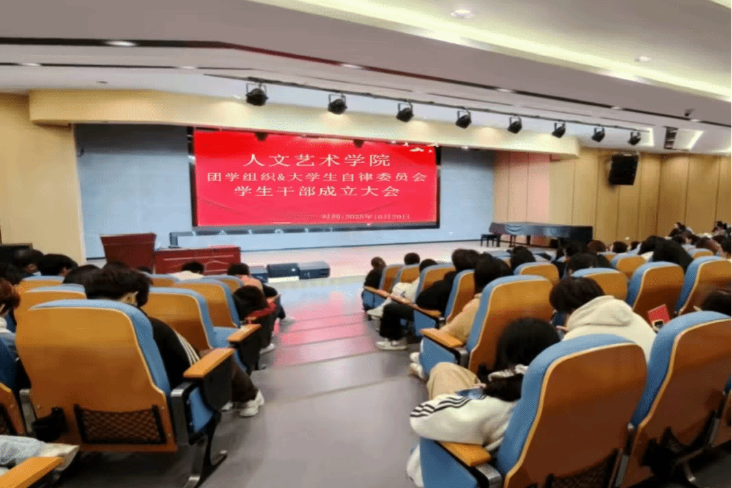 (通讯员 何雅婷)2025年10月20日,人文艺术学院团学组织及大学生自律委员会学生干部成立大会在庄严的国歌声中拉开帷幕。学院院长周新云教授、教务李扬希老师、学生工作牵头人李娅老师、辅导员廖洁毅老师、学院办公室郑艳芳老师、田礎豪老师,以及团学组织、自律委员会全体干部与各班班委共同出席了本次大会。