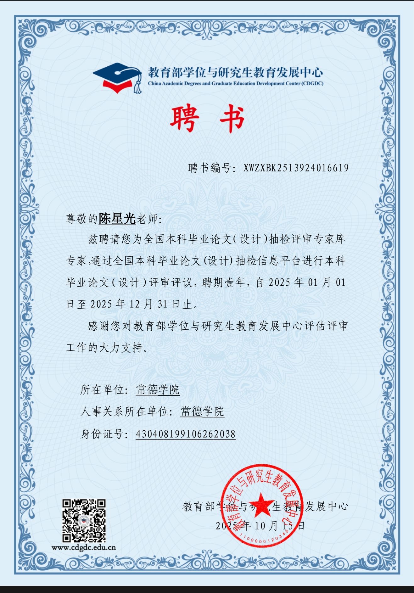 近日,我院陈星光老师成功获聘教育部学位与研究生教育发展中心“全国本科毕业论文(设计)抽检评审专家库”专家,聘期一年。