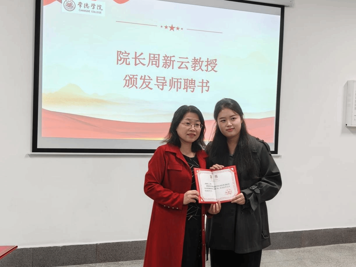 随后,学生工作负责人李娅老师宣读《人文艺术学院2025学年学业导师聘任决定》,并公布受聘导师名单。在热烈的掌声中,周新云院长为全体受聘导师逐一颁发聘任证书,师生共同合影留念,定格这一庄重时刻。导师代表罗小杰老师上台发言,他代表全体受聘导师郑重表态,将以高度的责任感和饱满的热情投入育人工作,用心陪伴学生成长,用专业助力学生成才。