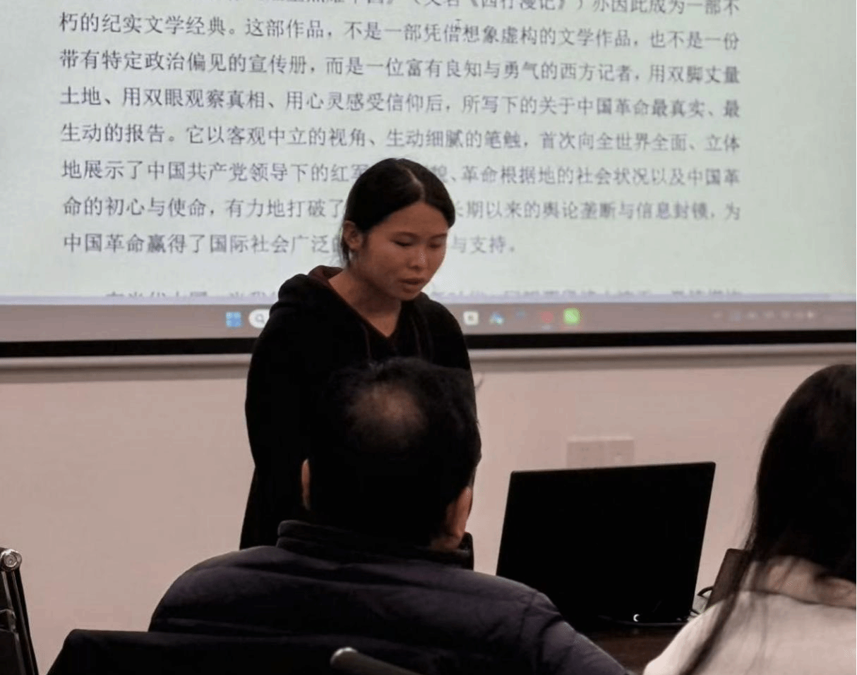 活动现场,主讲人唐雅惠同学以扎实的理论储备为基础,以饱满的情感为纽带,带领全场师生重温《红星照耀中国》中的红色记忆。她紧紧围绕埃德加·斯诺的陕北采访足迹展开讲述,既生动铺展了二万五千里长征的恢弘历史图景,又以细腻笔触刻画了毛泽东、周恩来等革命先辈胸怀远大理想、心系人民群众的鲜活形象。谈及书中动人情节时,唐雅惠同学特别聚焦红军医护人员的事迹:即便身处物资极度匮乏、生存环境恶劣的绝境,他们始终坚守“救死扶伤”的初心使命,用行动诠释医者担当。她由此深入剖析,指出这些看似朴素却极具冲击力的情节,正是中国共产党“以人民为中心”价值理念最真实、最深刻的历史映照,也与药学院师生“精研药学、服务民生”的追求高度契合。